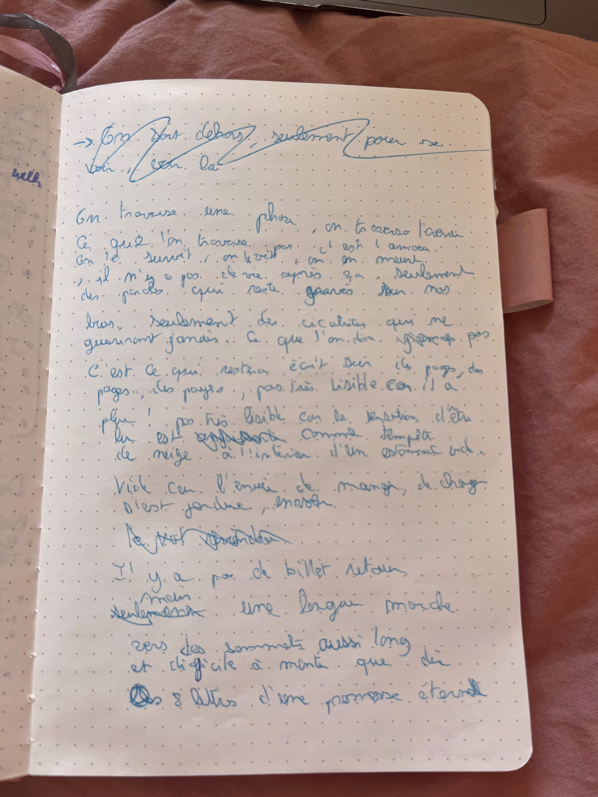 On traverse une phase, on traverse l'avenir. ce que l'on traverse pas c'est l'amour, on le survit, on le vit, on en meurt, il n'y a plus de vie. Après ça seulement des paroles qui restent gravés sur nos bras, seulement des cicatrices qui ne guérissent jamais. Ce que l'on dira pas c'est ce qui restera écrit sur des pages, des pages, des pages, pas très lisible car il a plu ! Pas très lisible car la sensation d'être lu est comme une tempête de neige à l'intérieur d'un estomac vide. Vide car l'envie de manger, de changer s'est perdue, envolée. Il n'y a pas de billet retour mais une longue marche vers des sommets aussi long et difficile à monter que dire ces 8 lettres d'une promesse éternelle.